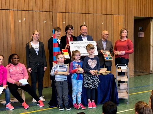 Dorit Schlüter, Vorsitzende des Stiftungsrates der Bürgerstiftung Bad Honnef hat am Freitag, 12.April zusammen mit Peter Endler, ebenfalls im Stiftungsvorstand einen großen Scheck in der Schulversammlung an Schulleiterin Nicola Kiwitt und Thomas Kollritsch (Vorsitzender des Fördervereins) übergeben. Kinder, Pädagogen und Eltern freuen sich sehr, dass der Ausbau der GGS Am Reichenberg als Montessori-Grundschule diese Wertschätzung erfährt.