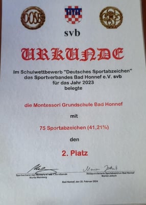 Mit insgesamt 75 Sportabzeichen bei 182 Schüler:innen im vergangenen Jahr konnte die Montessori-Grundschule Bad Honnefhinter der katholischen Grundschule St. Martinus den zweiten Platz unter den