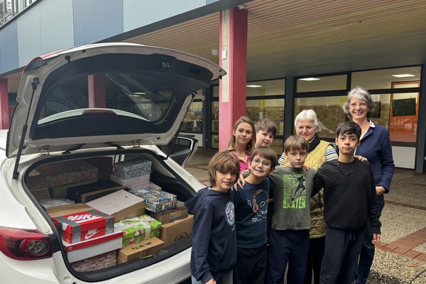 Schließlich waren es 70 Kartons, die in das Auto von Frau Bachmann-Richarz gepackt werden mussten. Kinder aus der Erdmännchen-Klasse bildeten eine Kette und so fand ein Päckchen nach dem anderen ganz schnell den Weg in den Kofferraum. Vielen herzlichen Dank an alle Eltern, die auf diese Weise Kindern in der Ukraine ein Weihnachtspäckchen zukommen lassen!